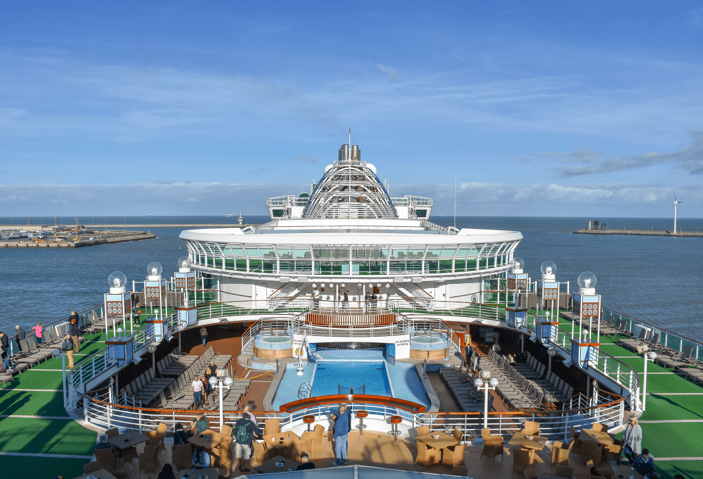 The outside pool offers a burger/hot dog station as well as ice cream and pizza. On sail away’ there is music played, and the theatre crew join you and dance on the small stage.