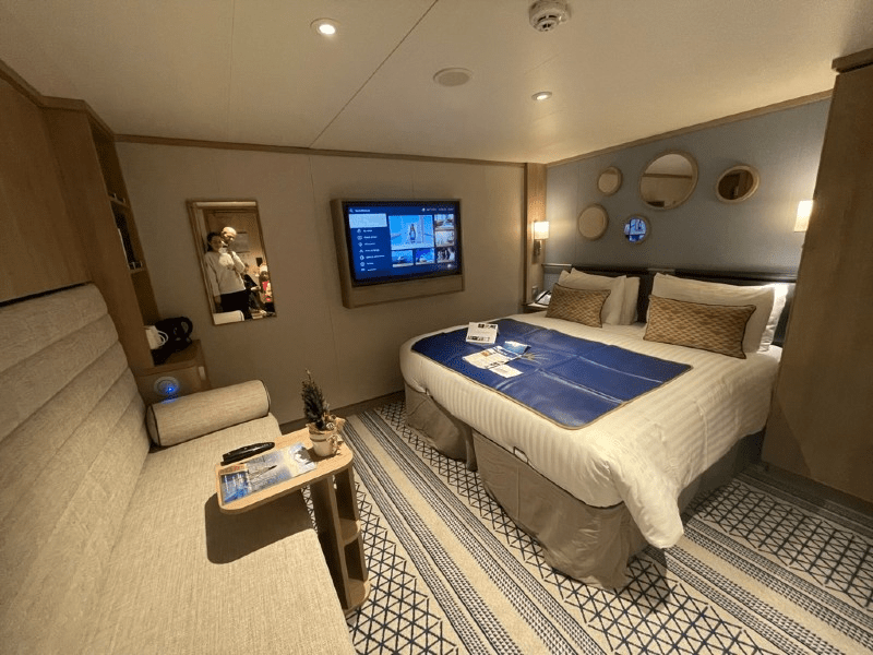 This is the cheapest option on the Arvia, and located in the interior of the ship. There is no option of natural light due to having no windows. For my family cruises growing up, we always chose a inside cabin as it was great value for money and we were too busy playing in the children’s clubs throughout the day. It is the perfect space to sleep. On the Iona I booked an inside cabin, this was great for saving money although, I was a bit out of shape not knowing what the weather was like or if we were near any land.
