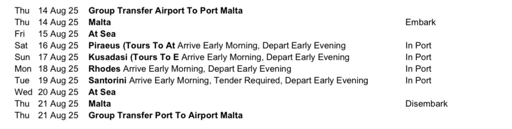 Every night you will be issued your own daily schedule for the next day onboard. This will highlight everything that is going on in the day such as;